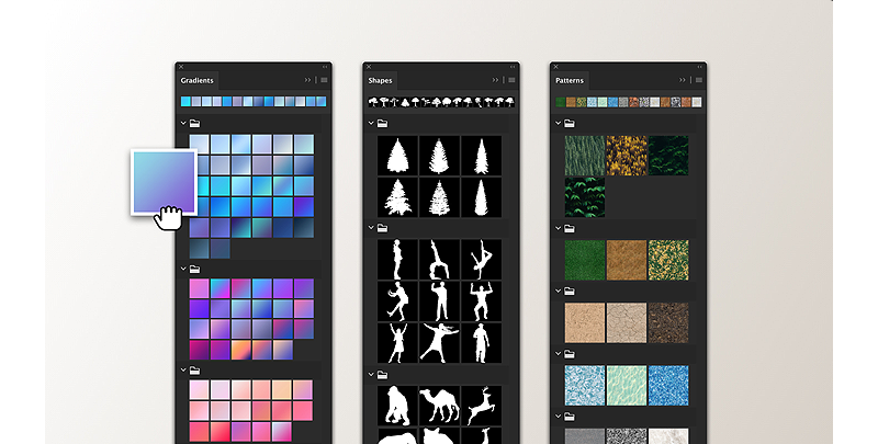 - Posibilidad de arrastrar degradados, motivos, muestras y estilos desde el panel de ajustes preestablecidos hasta el lienzo.