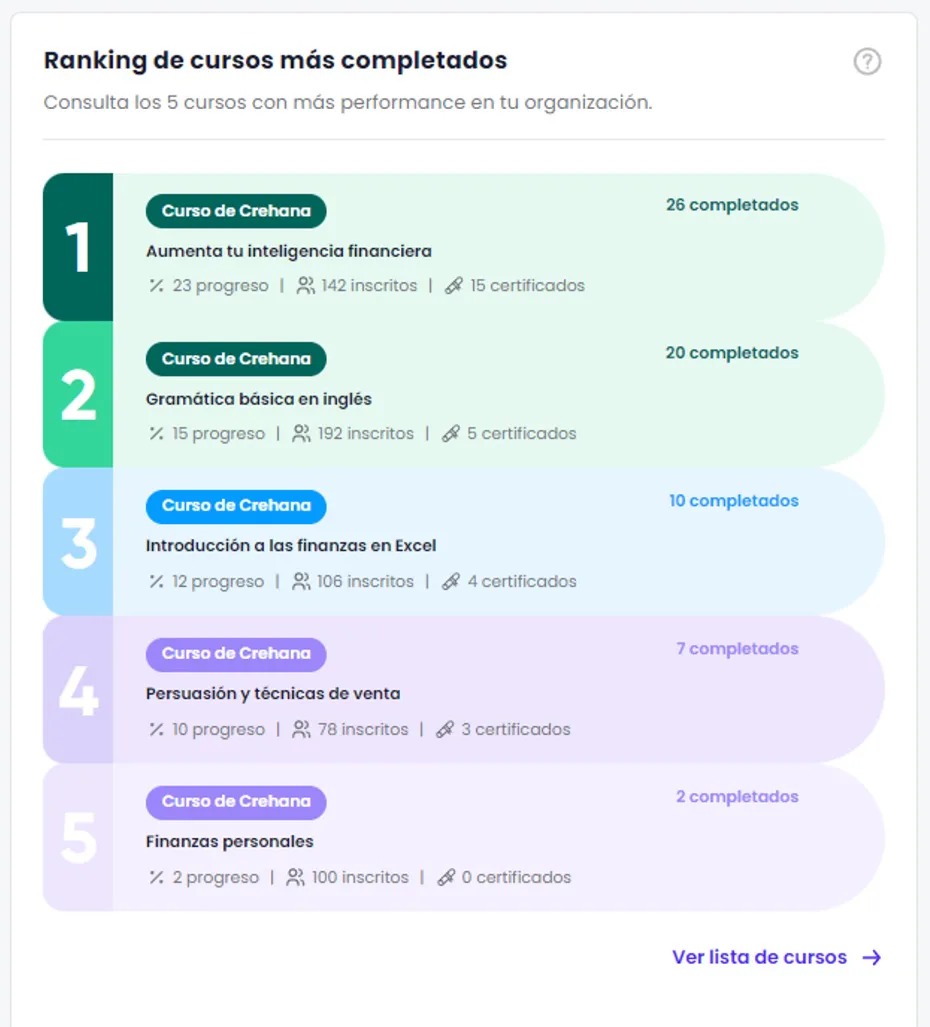 Muestra la totalidad de cursos disponibles para los estudiantes, distinguidos por cuántos están inscritos, cuántos se completaron, el porcentaje de completitud del curso, y el número de proyectos. Asimismo, permite descargar la información en un reporte con la totalidad de datos visualizados.
