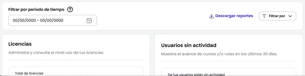 El dashlet de usuarios sin actividad busca identificar a los usuarios que no han interactuado con la plataforma de forma activa; es decir, que no han reproducido ni accionado sobre algún contenido de la plataforma, ya sea ingresando a un curso, presentando un proyecto o completando una evaluación.