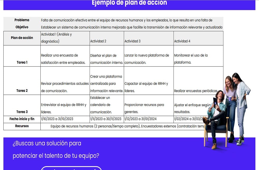En este sentido, puedes utilizar el ejemplo de plan de acción para gestionar grandes proyectos, como efectivamente es la transformación cultural de tu organización. Al final, puedes sistematizar los resultados y ofrecer conclusiones reveladoras para el proceso de transformación cultural.