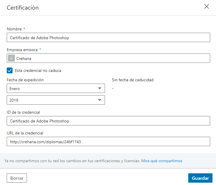 - Na guia URL da credencial, você deve adicionar o link da web do seu certificado Crehana, que aparece quando você obtém o certificado.